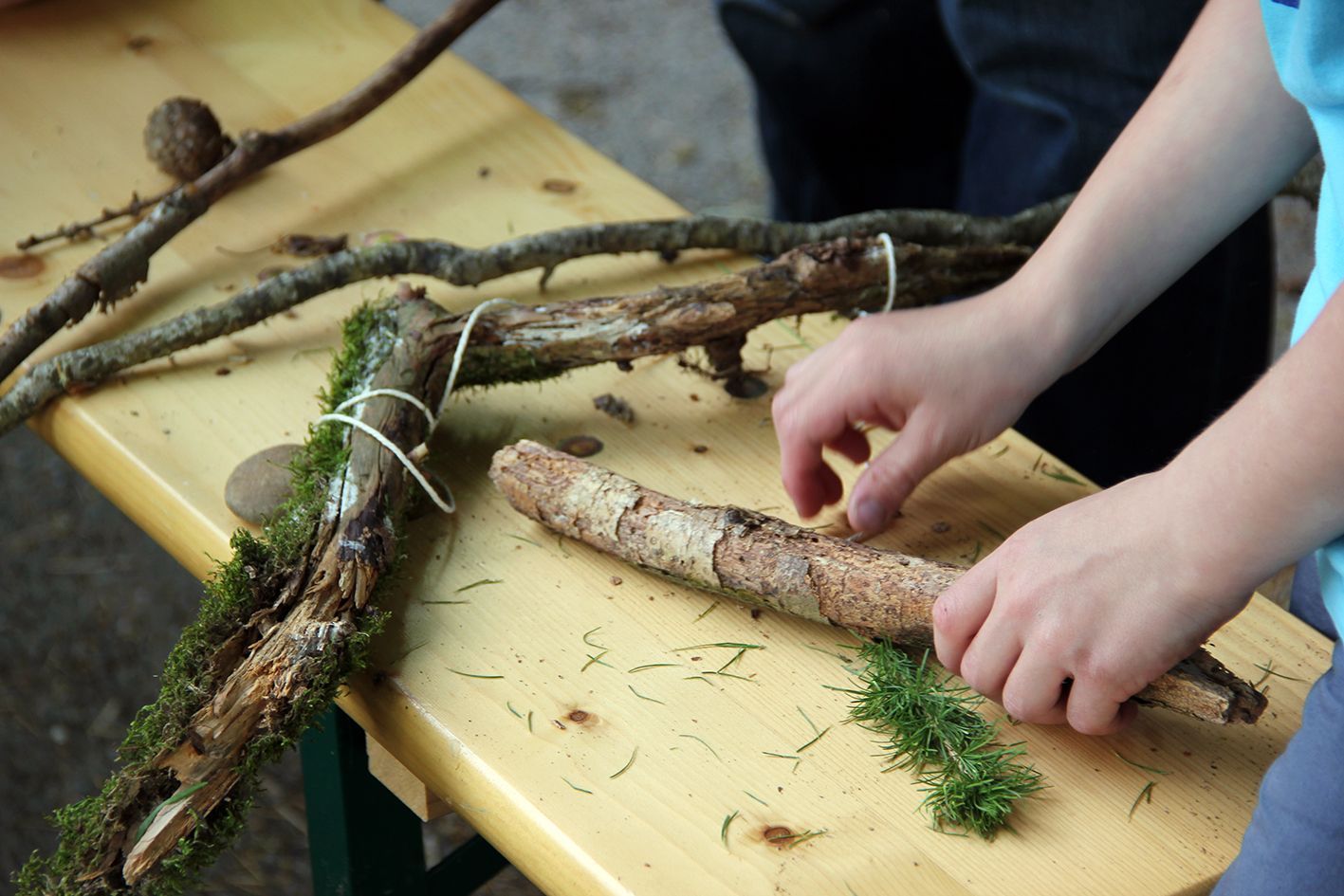 Geht in den Wald und sammelt kleine Äste, Zapfen, große Äste, Zweige mit Nadeln und ähnliches.